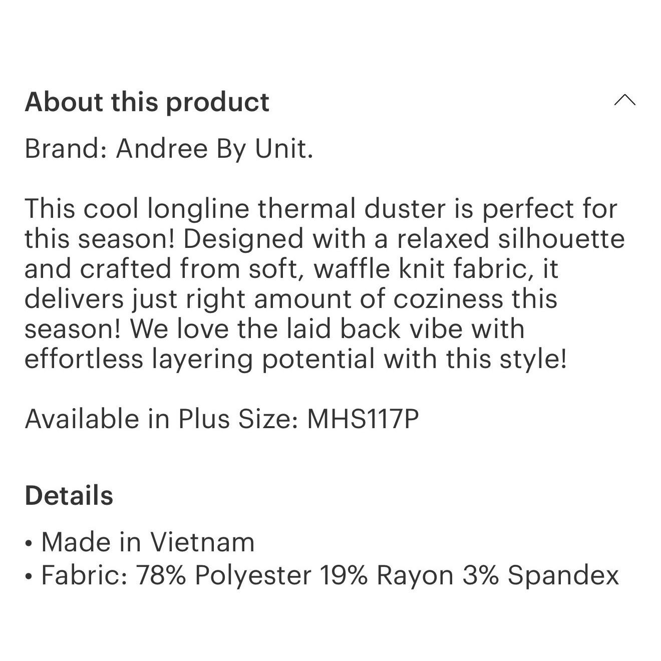 Andree by Unit – This cool longline thermal duster is perfect for this season! Designed with a relaxed silhouette and crafted from soft, waffle knit fabric, it delivers just right amount of coziness this season! We love the laid back vibe with effortless layering potential with this style! Fabric: 78% Polyester 19% Rayon 3% Spandex