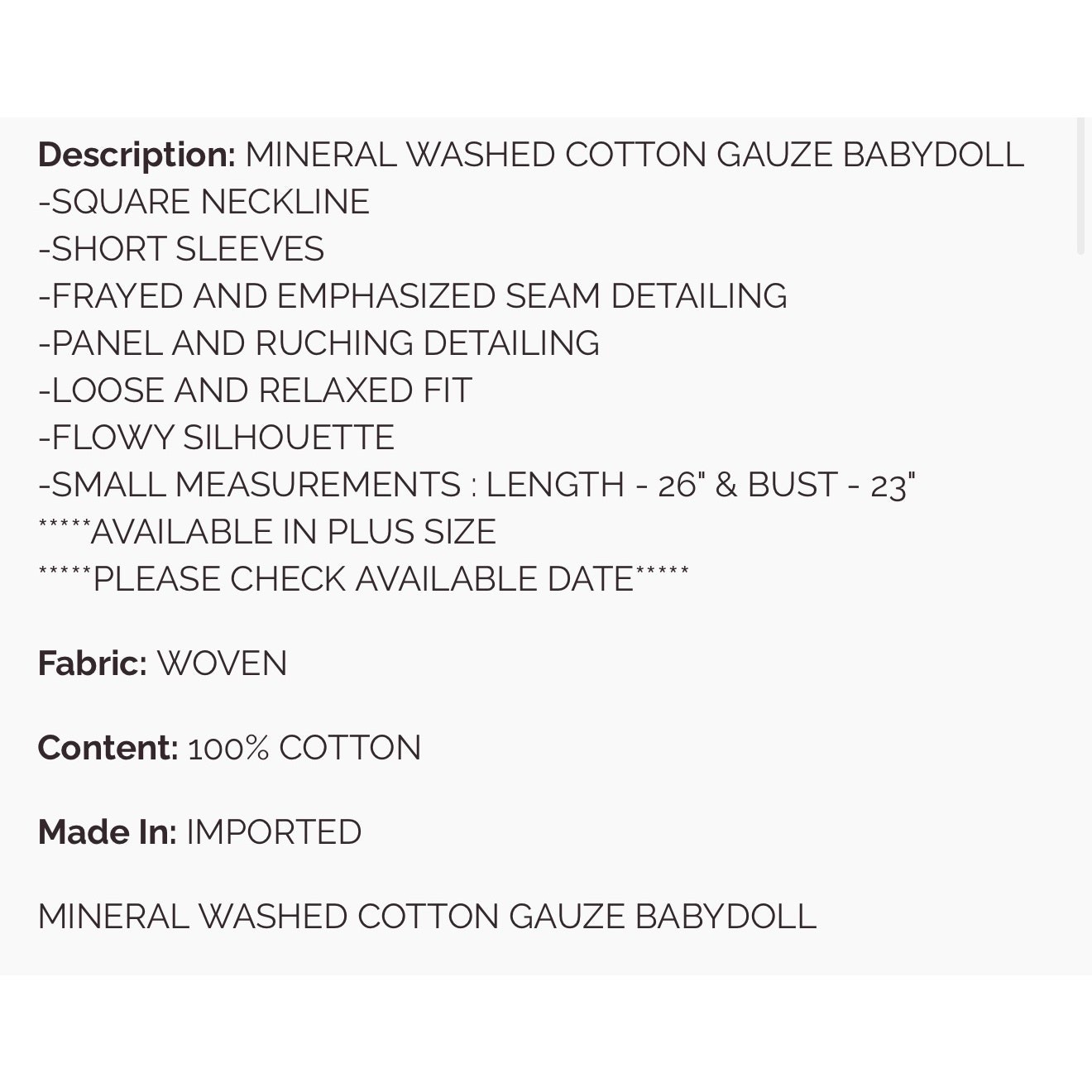 Discover ultimate comfort and style with this delightful Easel Mineral Washed Cotton Babydoll Top! Perfect for adding a touch of relaxed elegance to your wardrobe, this top features a beautiful mineral wash finish that gives it a unique, lived-in charm.