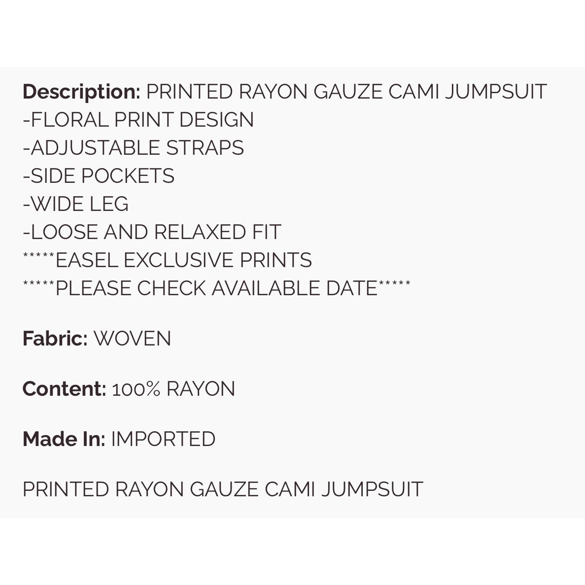 Discover your new favorite warm-weather essential with this charming Easel Printed Rayon Gauze Cami Jumpsuit! It's an absolutely delightful piece that combines effortless style with ultimate comfort, perfect for those sunny days or balmy evenings. Crafted from a soft and breathable rayon gauze fabric, this jumpsuit feels incredibly light against your skin, making it a joy to wear all day long. The eye-catching print adds a touch of bohemian flair and personality, ensuring you stand out in the best way possible. Its flattering cami design offers a relaxed fit, while the adjustable straps provide a customized and comfortable feel. Whether you're heading to a casual brunch, enjoying a beach vacation, or simply lounging at home, this versatile jumpsuit is your go-to option. Pair it with your favorite sandals for a laid-back look or dress it up with some wedges and accessories for a more elevated ensemble.