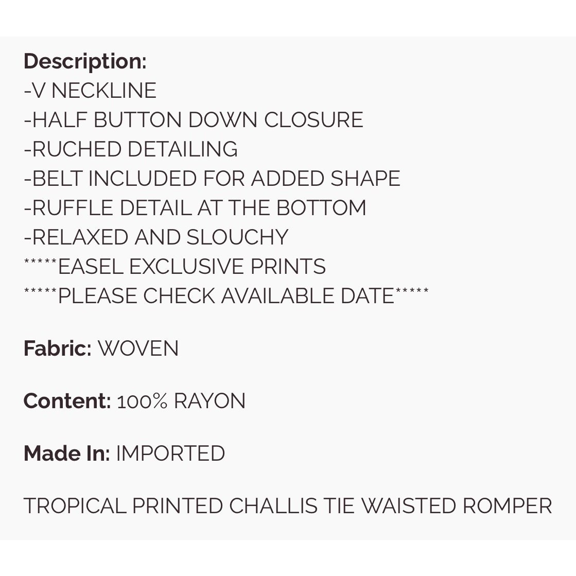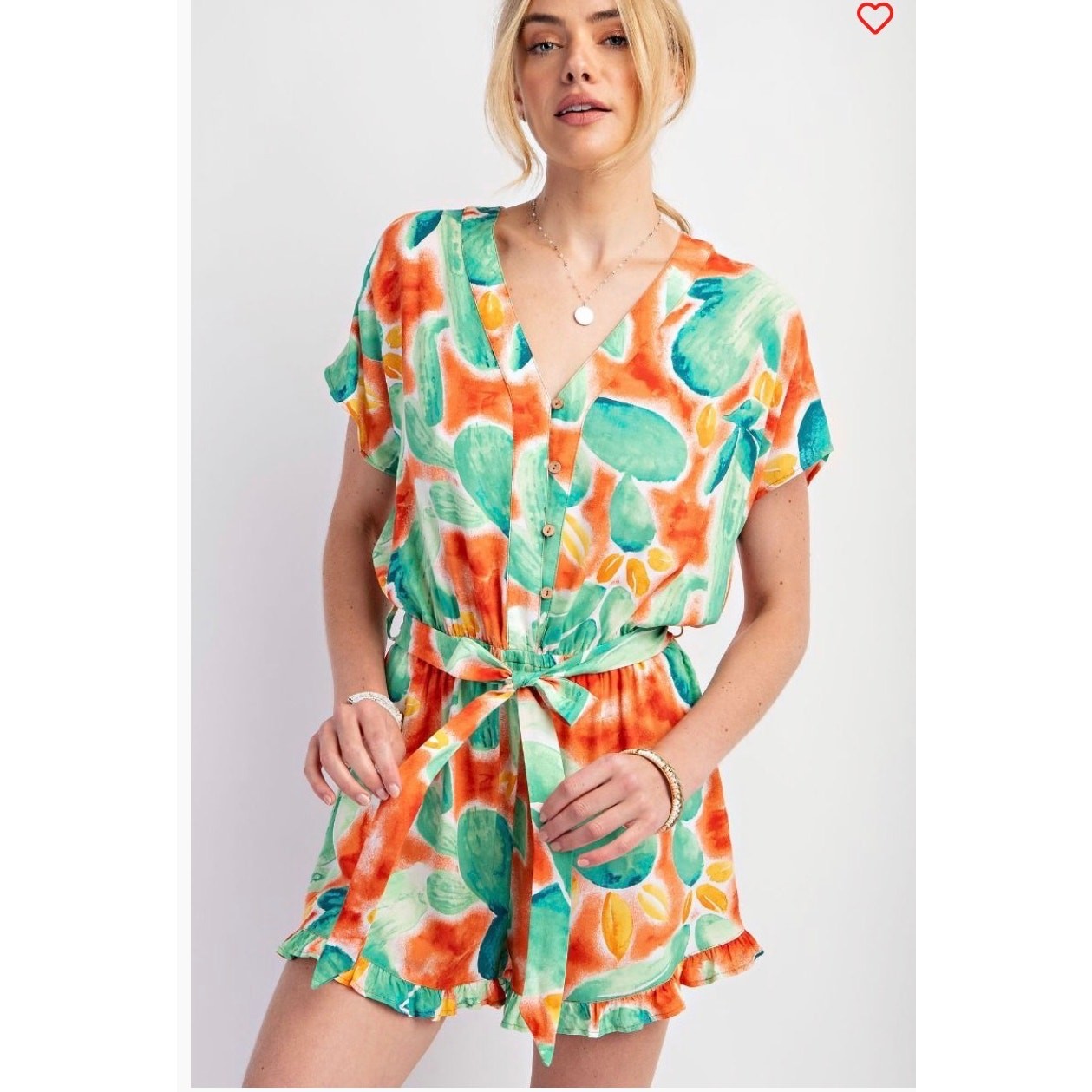 Get ready for sunny days and tropical vibes with this absolutely charming Easel Tropical Challis Tie Waisted Romper! Perfect for your next vacation or a lovely day out, this romper combines effortless style with ultimate comfort. Crafted from soft, breathable challis fabric, it feels wonderful against your skin, making it an ideal choice for warmer weather. The vibrant tropical print is sure to brighten your day and add a playful touch to your wardrobe. Featuring a flattering tie waist, this romper accentuates your figure beautifully while offering a comfortable, relaxed fit. It's incredibly versatile – dress it up with wedges and statement jewelry for a chic evening look, or keep it casual with sandals and a wide-brimmed hat for a relaxed beach day. Don't miss out on this fantastic piece that's sure to become a favorite in your collection! Grab it now and embrace the fun, carefree spirit of summer. 100% Rayon