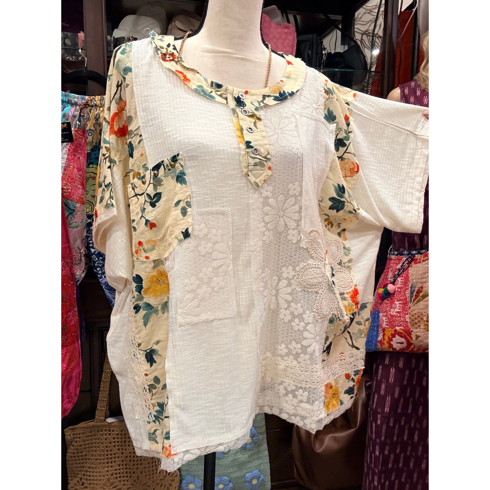 POL – Round Neck Short Sleeve Floral Knit Rib Top. Designed in round neck, short sleeve, relaxed fit top in rib with patch detail pointed floral pattern. 61% Polyester 33% Rayon 6% Spandex