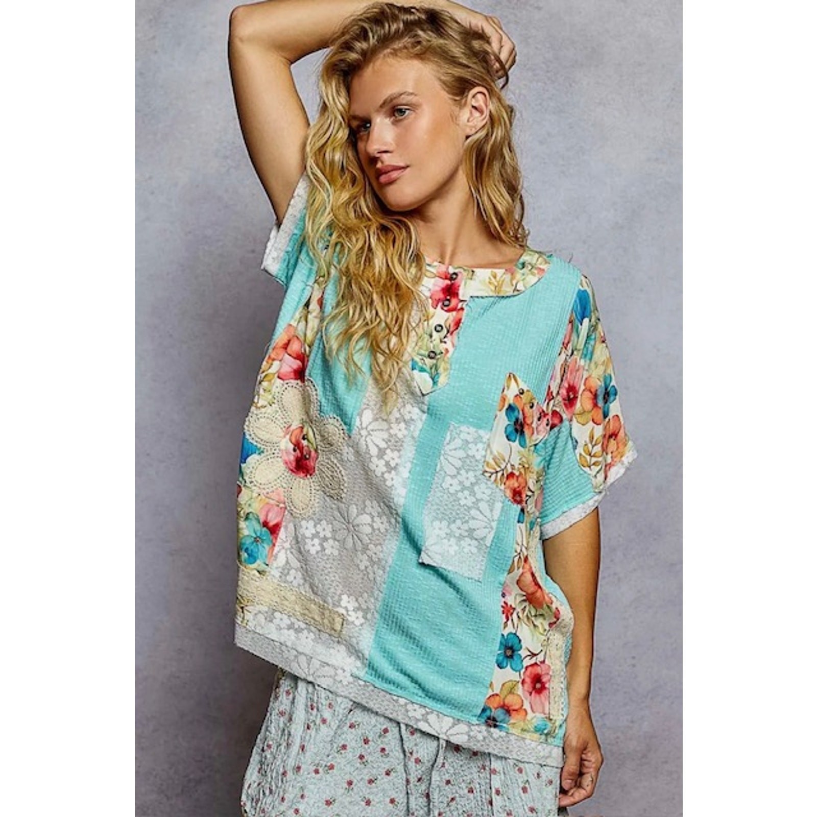 POL – Round Neck Short Sleeve Floral Knit Rib Top. Designed in round neck, short sleeve, relaxed fit top in rib with patch detail pointed floral pattern. 61% Polyester 33% Rayon 6% Spandex