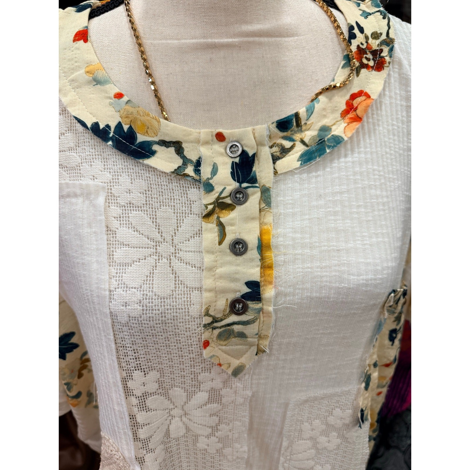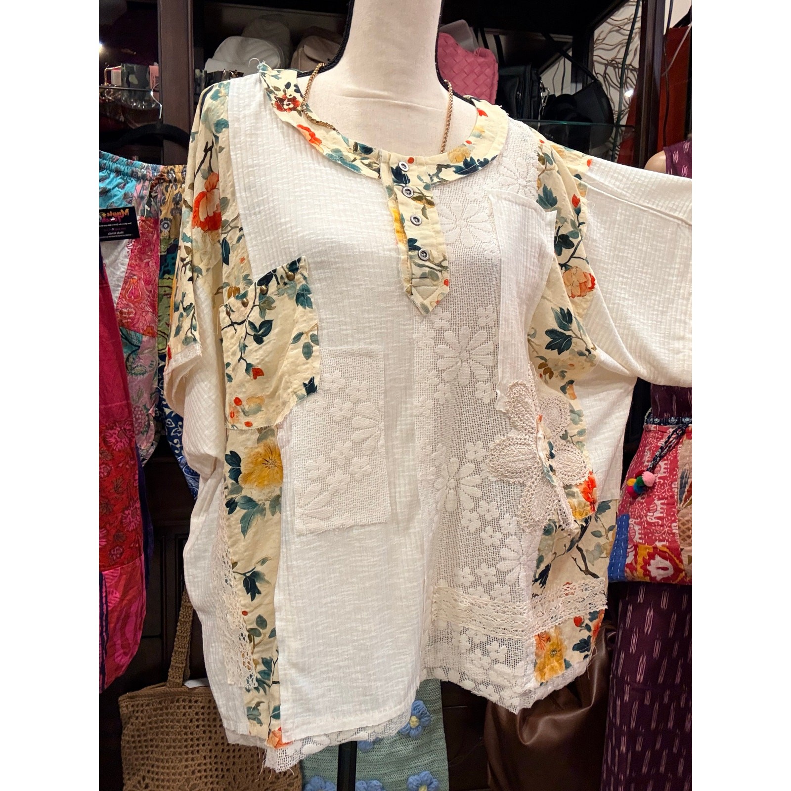 POL – Round Neck Short Sleeve Floral Knit Rib Top. Designed in round neck, short sleeve, relaxed fit top in rib with patch detail pointed floral pattern. 61% Polyester 33% Rayon 6% Spandex