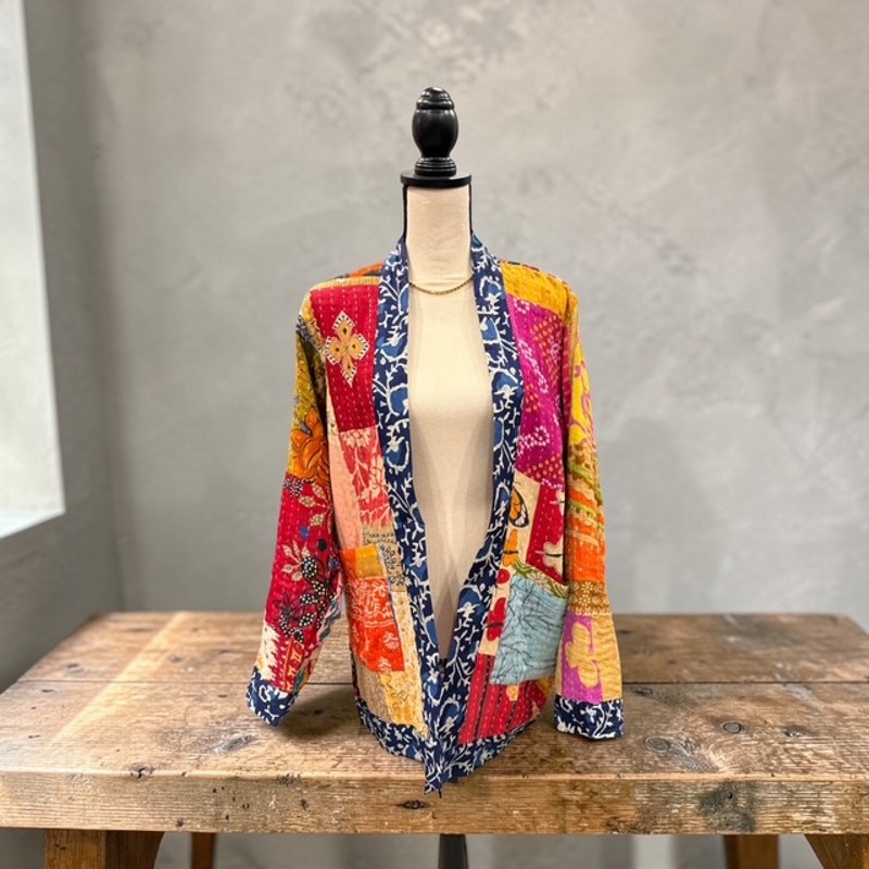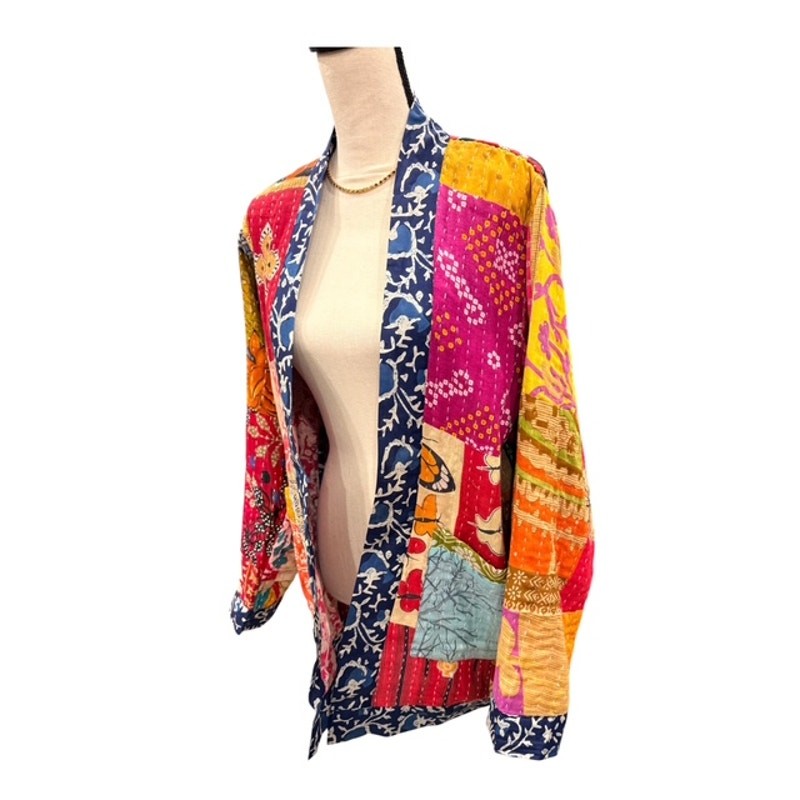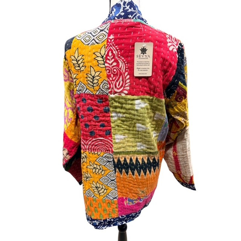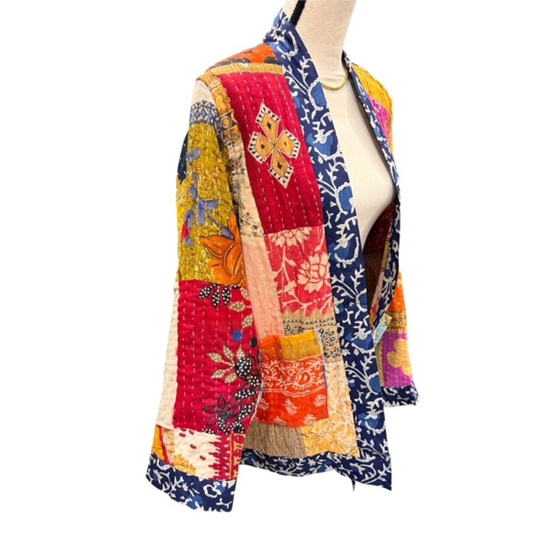 Discover the unique charm of this beautiful Sevya Handmade Kantha Reversible Jacket! This stunning piece is truly one-of-a-kind, showcasing intricate Kantha stitching that tells a story with every thread. It's a fantastic addition to any wardrobe, offering versatility and style. This jacket is perfect for adding a bohemian touch to any outfit. It's lightweight enough for a cool evening but also provides a nice layer of warmth when needed. A wonderful choice for those who appreciate artisan craftsmanship and sustainable fashion. The vibrant patterns and colors are sure to brighten your day and draw compliments. It's incredibly easy to care for and maintain, making it a practical choice for everyday wear. The 'One Size' fit is designed to comfortably drape on a variety of body types, ensuring a relaxed and fashionable silhouette. Perfect for layering over a simple tee or dress, this jacket adds a touch of artisanal elegance to your everyday ensemble. Whether you're heading out for a casual brunch or just enjoying a cozy evening, this Kantha jacket will keep you looking effortlessly chic and feeling wonderful. Embrace handcrafted beauty and make a statement with this amazing jacket! Upcycle Saris Cotton