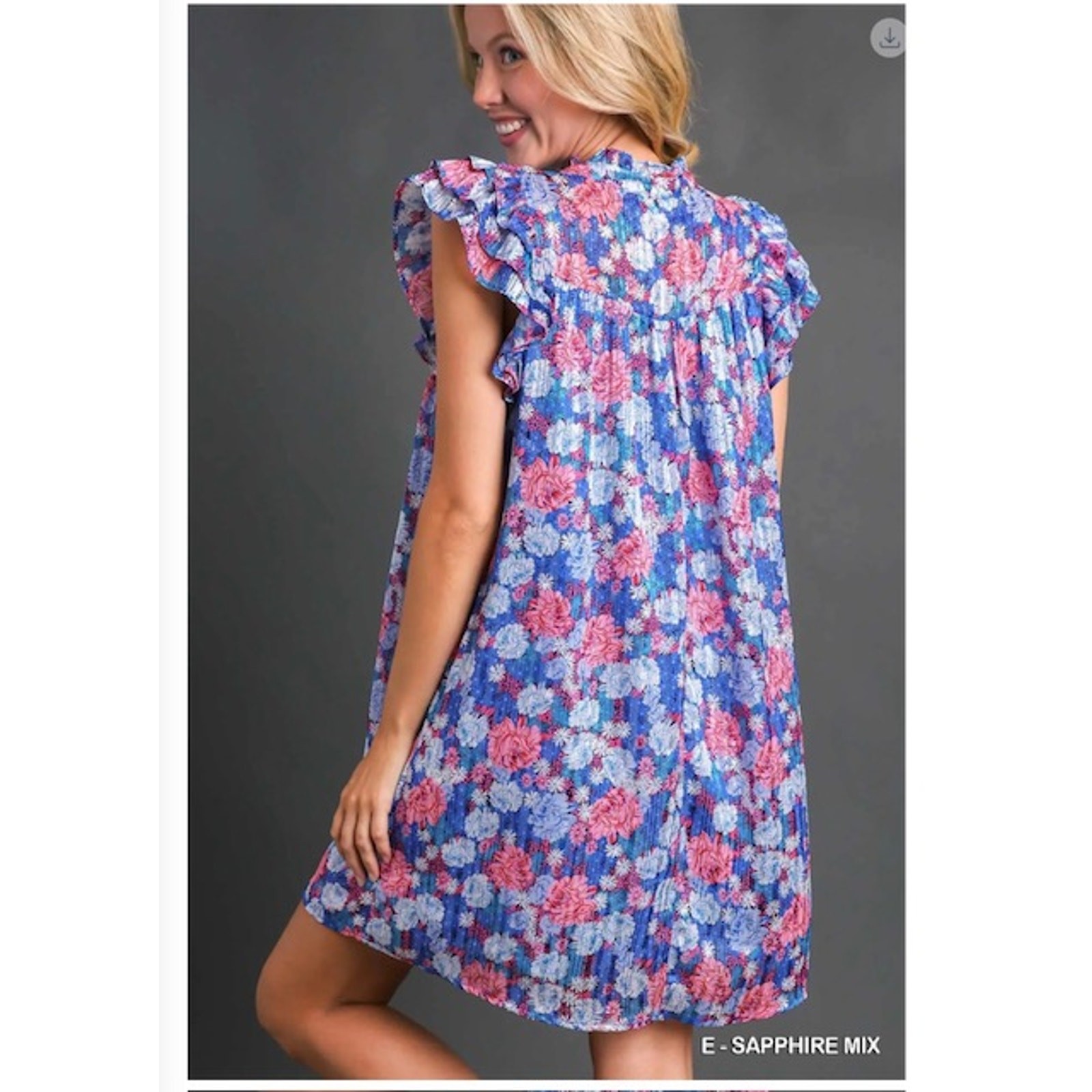 Step out in style with this absolutely charming Umgee Metallic Mixed Print Split Neck Ruffle Dress! This gorgeous piece is perfect for adding a touch of bohemian chic to your wardrobe. The eye-catching mixed print, combined with subtle metallic accents, creates a unique and vibrant look that's sure to turn heads. Featuring a flattering split neck design and playful ruffle details, this dress offers both comfort and undeniable elegance. It's an ideal choice for a casual day out, a weekend getaway, or even a relaxed evening event. Pair it with your favorite sandals for a breezy summer vibe or dress it up with some delicate jewelry and wedges for a more elevated ensemble. You'll love how versatile and effortlessly stylish this dress is! Don't miss out on this fantastic addition to your collection. 97% Polyester 3% Metallic Color is E-Sapphire