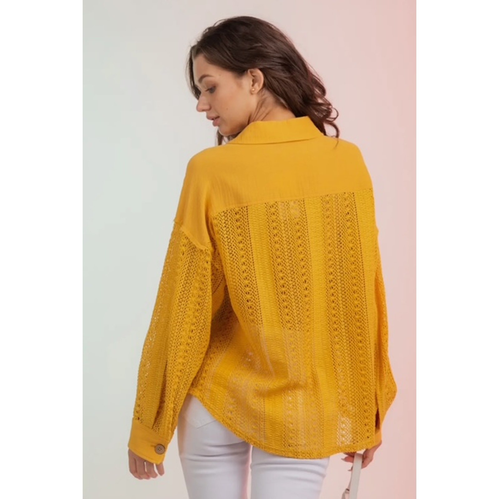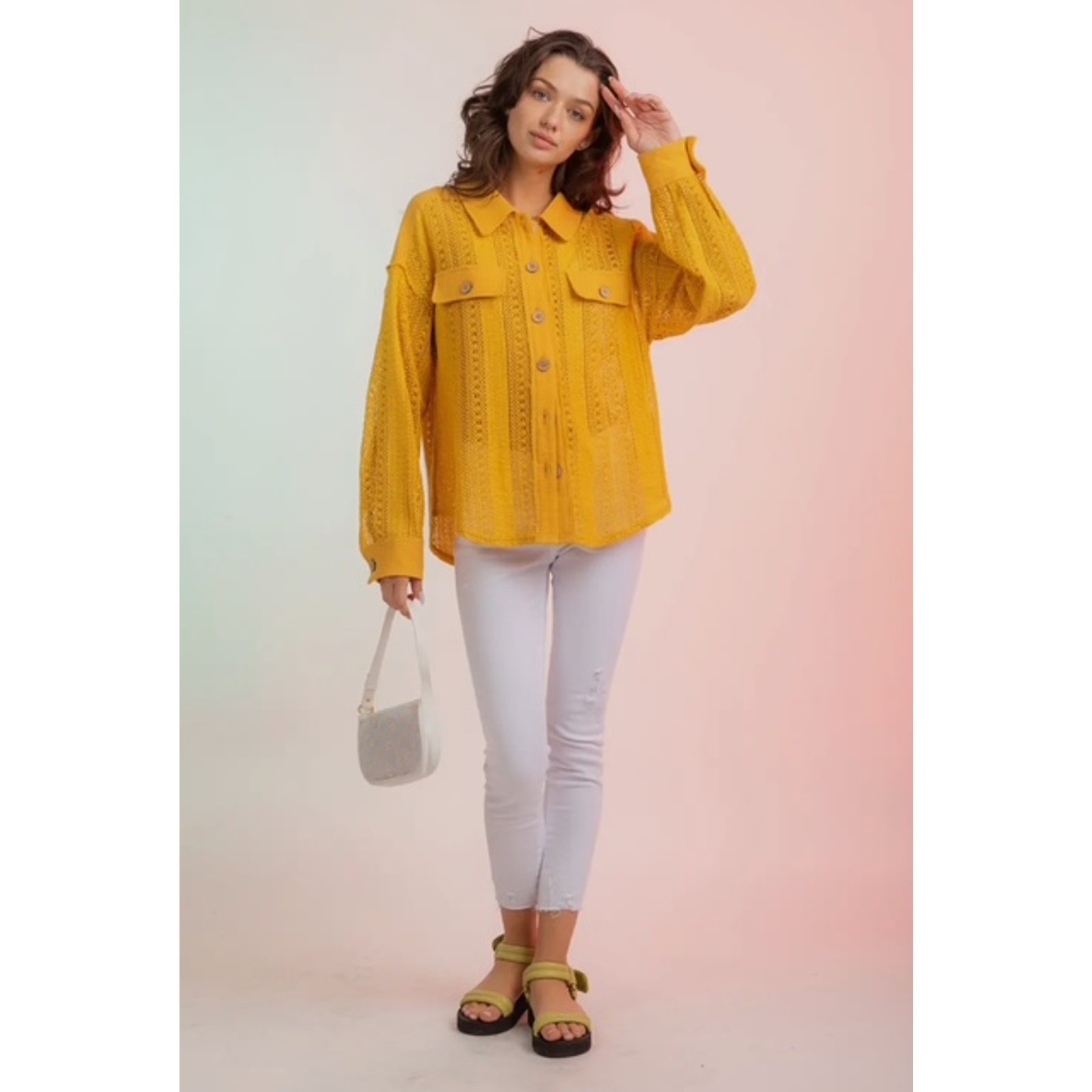Very J – Lace Crochet Button Down Sheer Shacket. -Long Sleeve Crochet Button Down Shacket