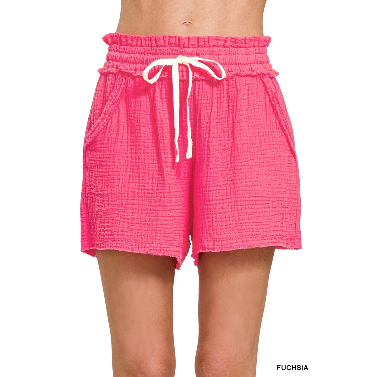 ZENANA – DOUBLE GAUZE ELASTICBAND DRAWSTRING WAIST SHORTS WITH POCKETS.