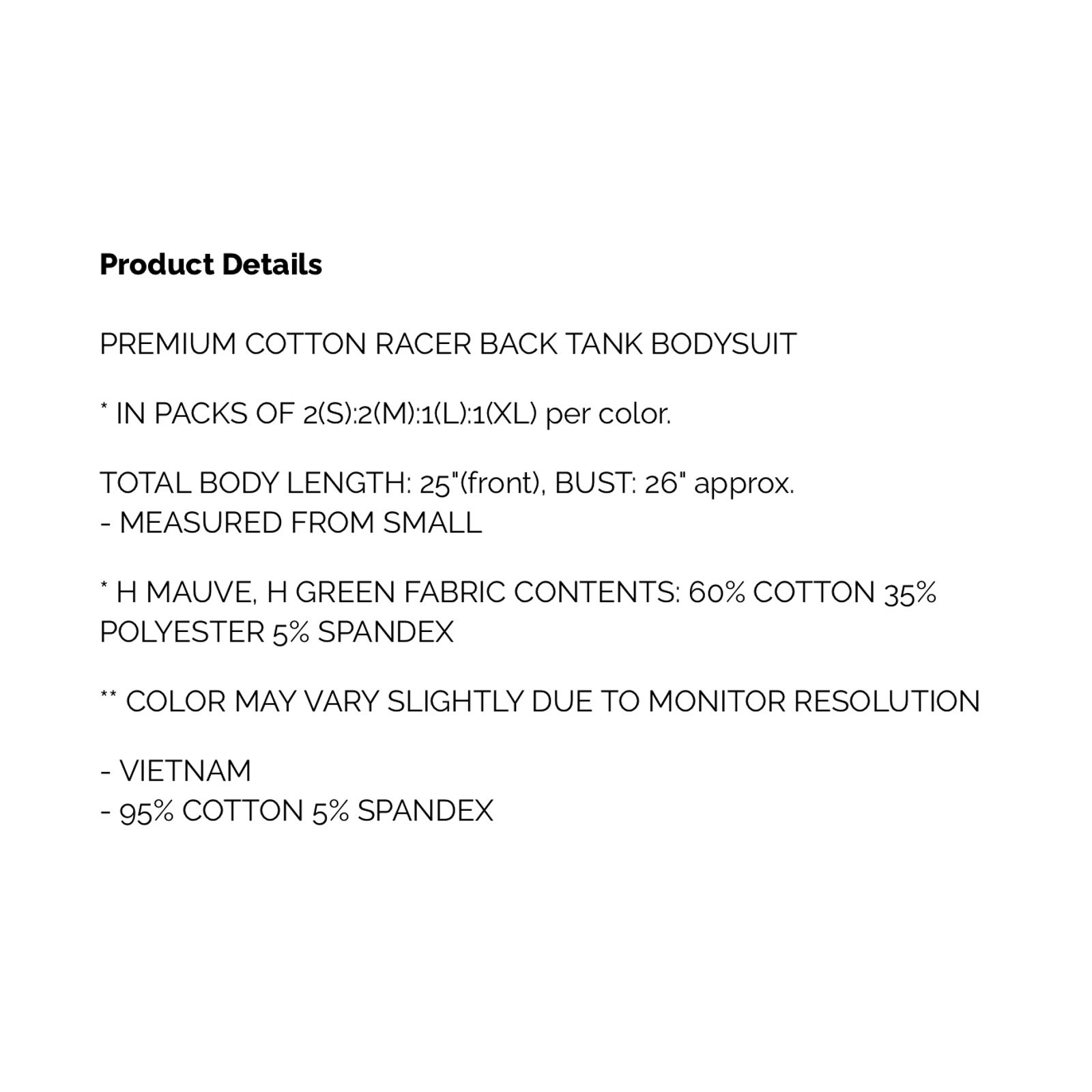 This Zenana premium cotton racerback tank bodysuit is a must-have addition to your wardrobe! Crafted from soft and breathable cotton, it offers a comfortable and flattering fit. The racerback design adds a sporty touch, while the bodysuit style ensures a sleek and seamless look. Perfect for layering or wearing on its own, this versatile piece can be dressed up or down for any occasion. Whether you're hitting the gym, running errands, or going out with friends, this bodysuit will keep you feeling confident and stylish all day long. 95% COTTON 5% SPANDEX