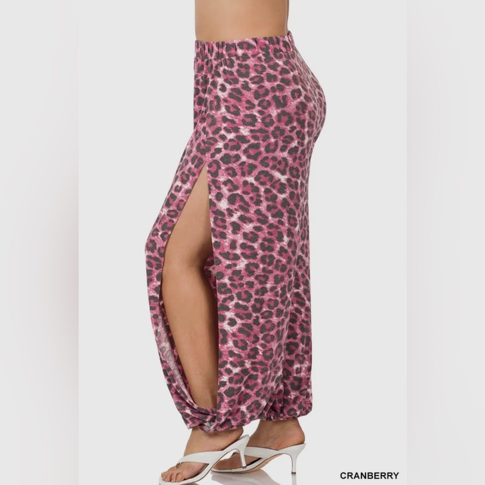 Turn heads with this stunning cranberry leopard print side split pants. Perfect for a bold and stylish look.