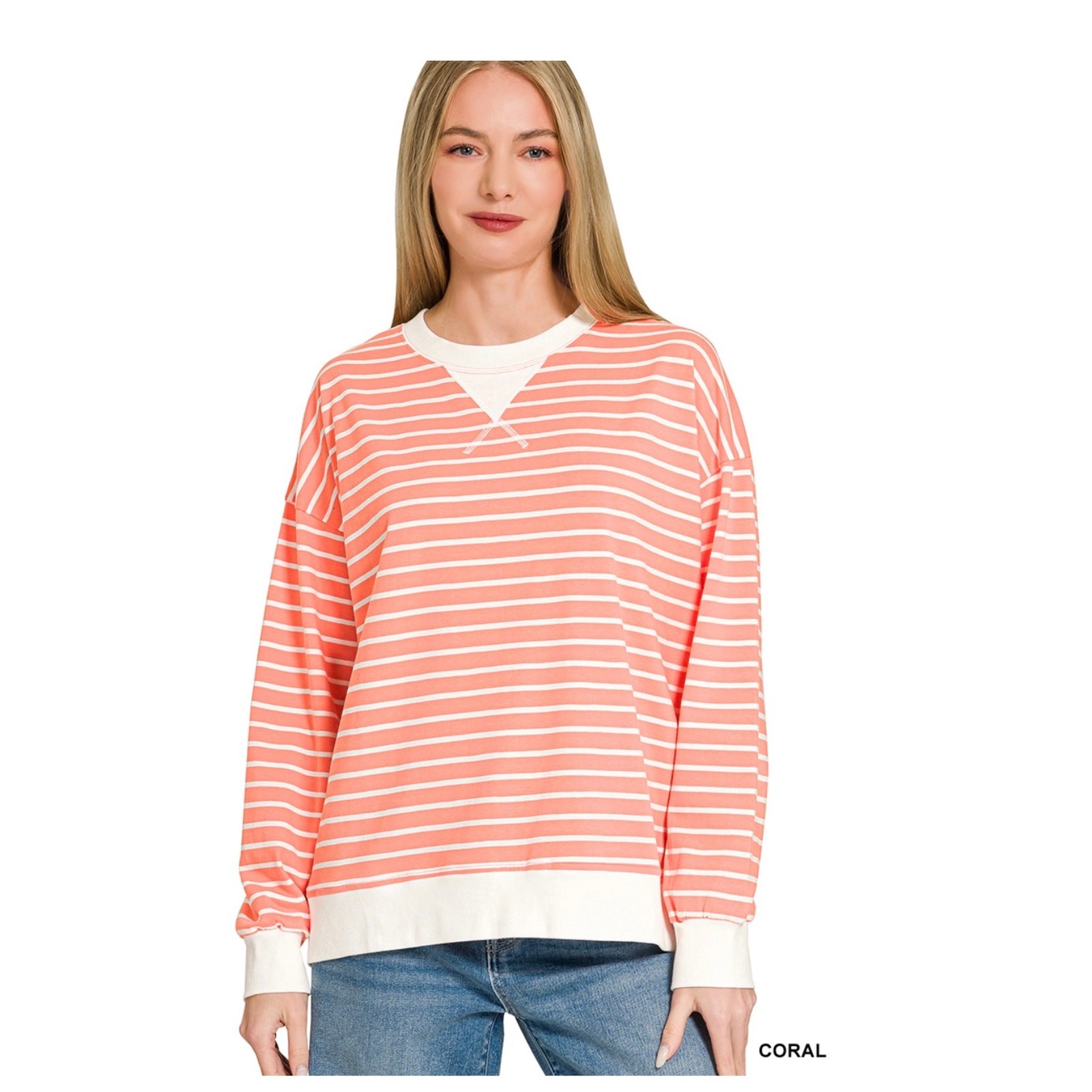 Get ready for Spring with this beautiful coral and white striped pullover. Made by Zenana 95% cotton 5% spandex.
